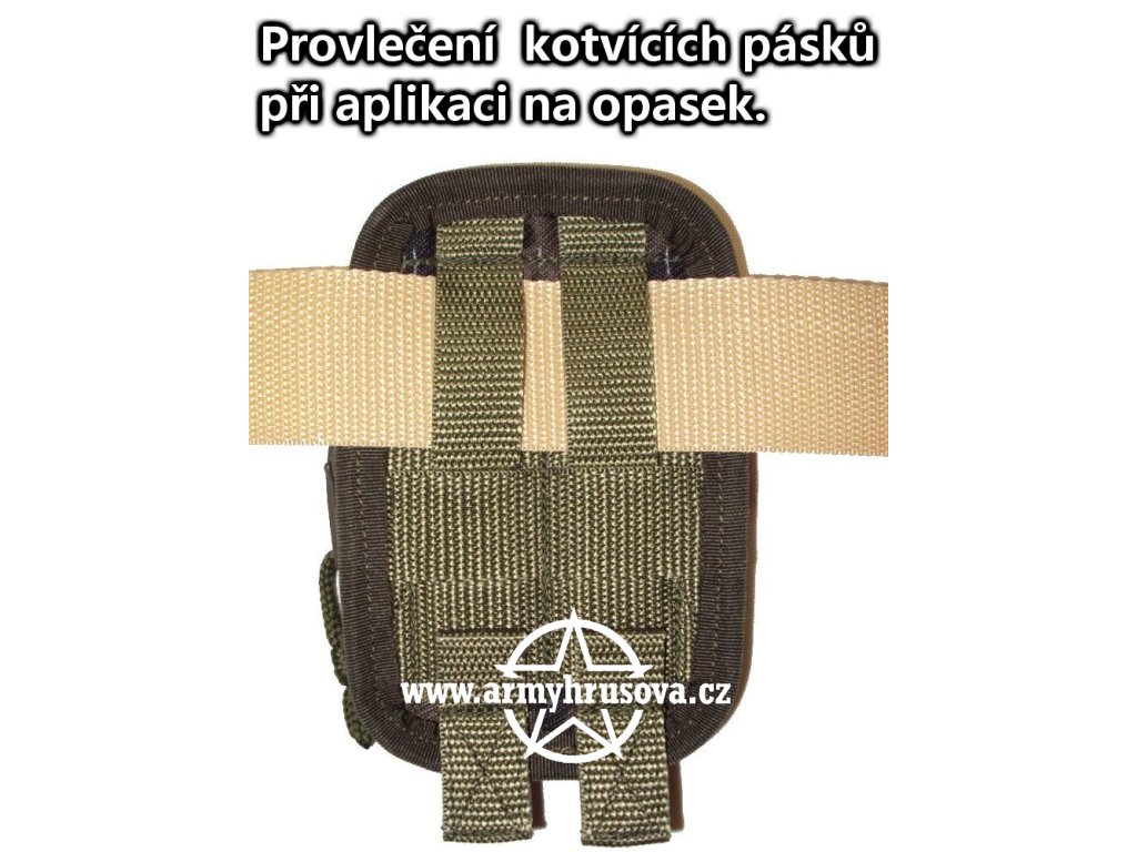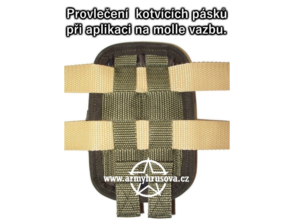 Molle vazba je na pouzdru upravena tak aby šlo pohodlně nosit i na opasku šíře 40/50 mm.